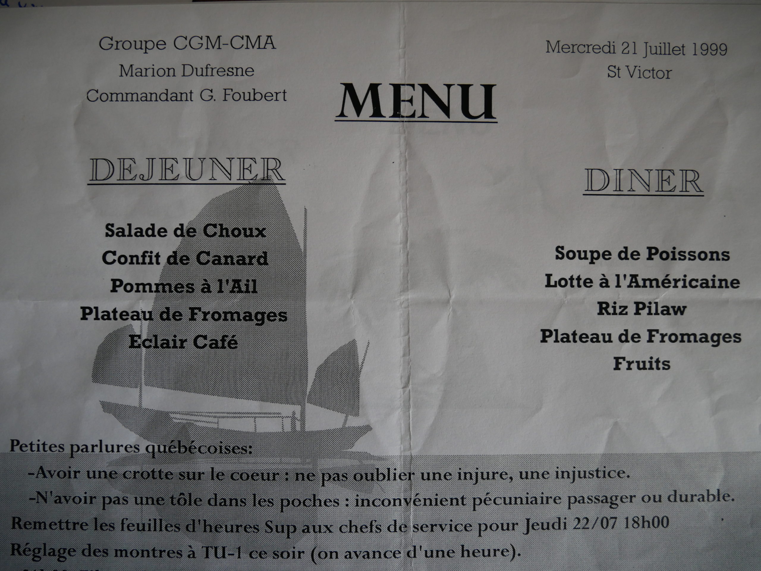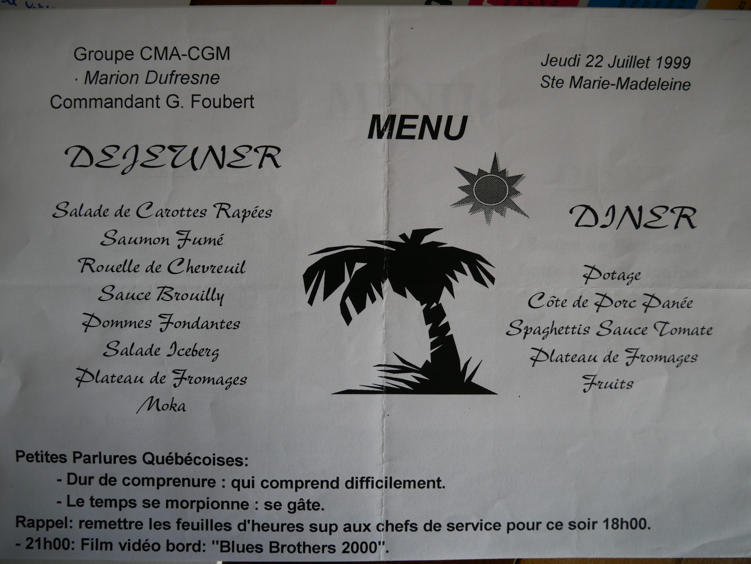 Il y avait bien sûr le travail, mais aussi les moments de convivialité, notamment autour des repas. J’ai trouvé la restauration excellente, au point de conserver presque tous les menus proposés à bord du Marion Dufresne.