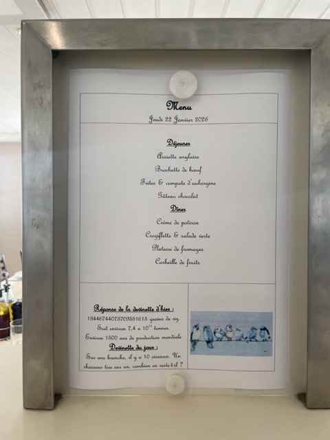 Il y a toujours entrée, plat, fromages et dessert ! C’est très bon et les quantités sont importantes, pour mes collègues Eric et Antonin qui mesurent plus d’ un mètre quatre-vingt dix c’est bien, mais pour moi qui ai un petit appétit, c’est un peu trop ahah !
