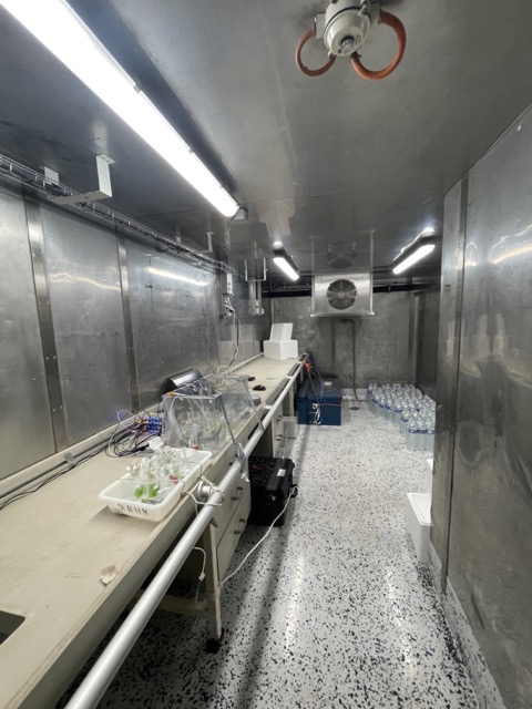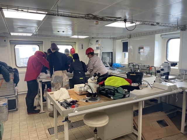 Il y a plusieurs laboratoires à bord du Marion Dufresne, chaque équipe à plusieurs pièces où elle peut travailler. Pour notre équipe nous avons une pièce sur le pont arrière, juste à côté du filet de chalutage pour trier rapidement les animaux, une pièce pas loin pour faire le tri et l’observation approfondi et un laboratoire à côté des chambres froides pour pouvoir mettre des animaux « au frais » pour certaines expériences comme les mesures de respiration ou les chocs thermiques.