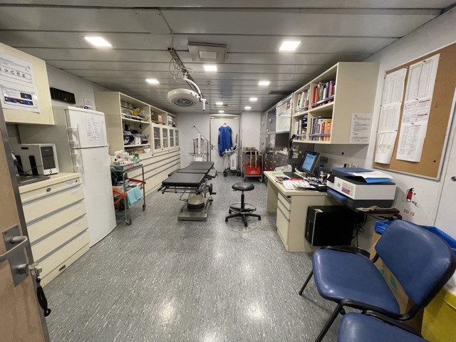 Le navire est aussi équipé d’une pièce infirmerie/ hôpital, et surtout du médecin qui vient avec, pour prendre soin des personnes à bord. Notre médecin fait également son premier voyage à bord et il est prêt pour intervenir en cas de besoin, aussi bien pour les personnes qui ont le mal de mer, ou des coups de soleil que ceux qui ont une entorse (ouïle) ! Il était médecin militaire urgentiste (près à gérer les situations médicales urgentes) et continu à travailler pour le plaisir :-), trop sympa !