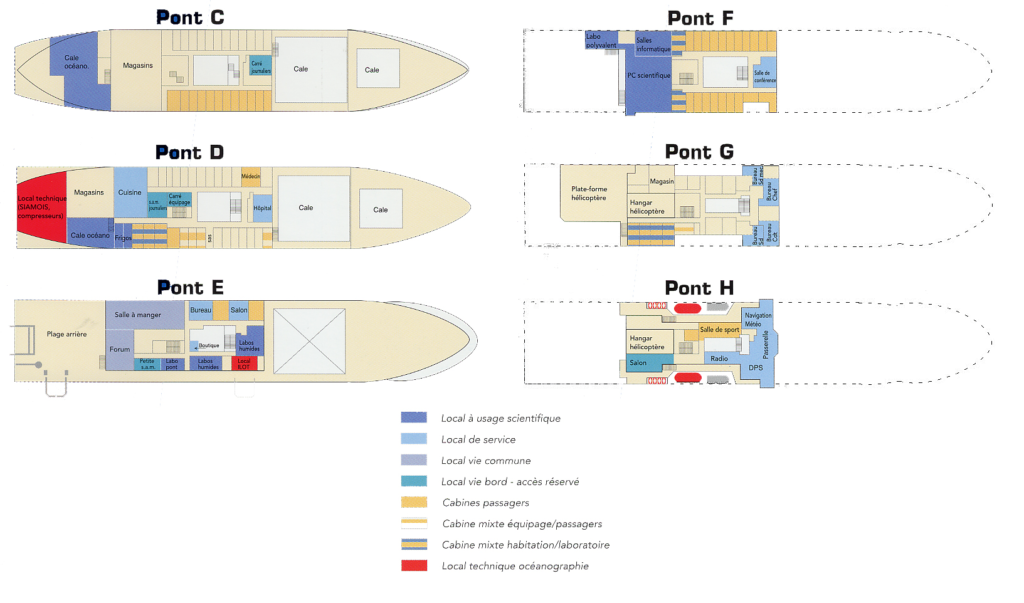 En plus de la cabine personnelle, les salles de travail et la salle à manger (on appelle cela le forum au pont E), il y a des pièces à vivre pour se détendre et se rencontrer en dehors des temps de travail.